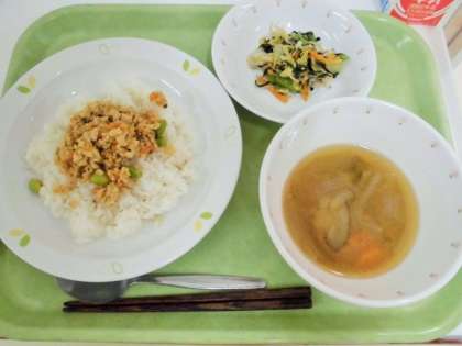 献立 高野豆腐のふわふわそぼろ丼、小松菜ののり和え、五目みそ汁、牛乳