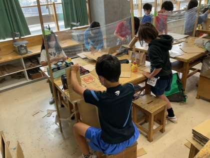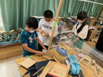 図工の時間です。ダンボールを自由に組み合わせて、自分だけのオリジナル作品を作っていきます。