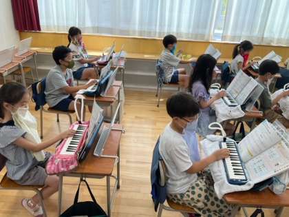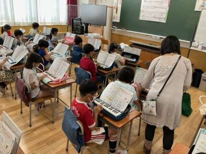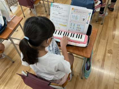 音楽の時間です。鍵盤ハーモニカの練習をしています。指づかいがとても上手になりました。