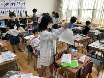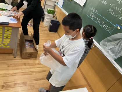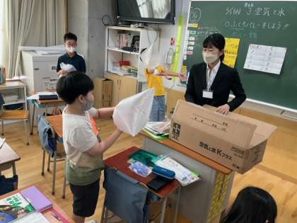 理科の時間です。「空気と水」の1時間目です。ポリ袋を使って、空気を閉じ込めます。閉じ込めた空気を押すとどんな感じかな?