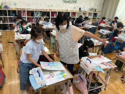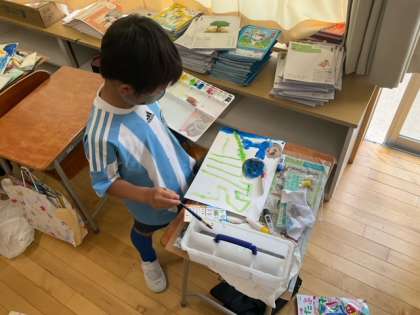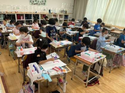 図工の時間です。「えのぐじま はっけん!」形や色、筆の使い方を工夫して、伸び伸びと絵の具島を描いています。