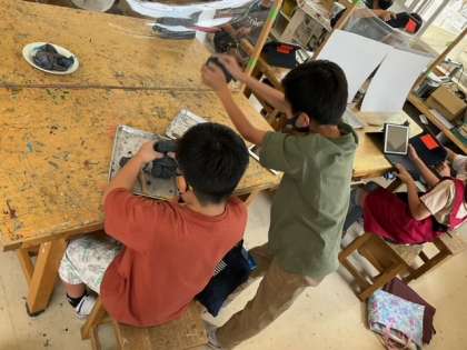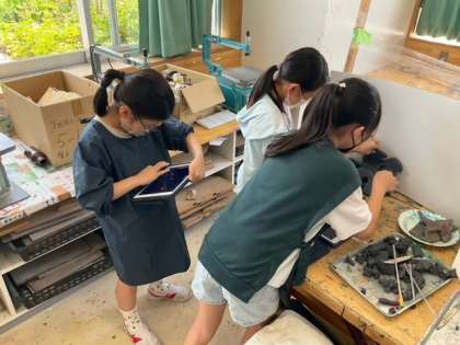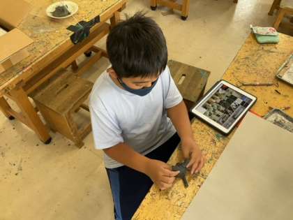 図工の時間です。「つけて、のばして、生まれる形」ねん土をにぎって、のばして、けずって、かき出して。さあ、どんな形が生まれるのかな?