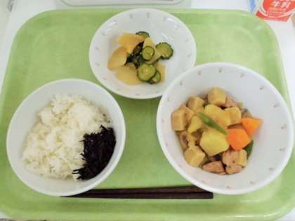 献立 ご飯、梅ひじきふりかけ、鶏肉とじゃが芋のうま煮、きゅうりと大根のごま風味和え、牛乳