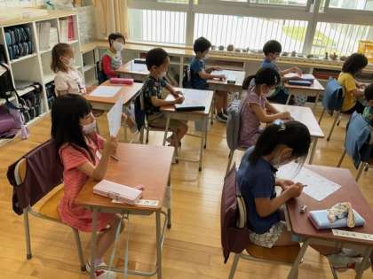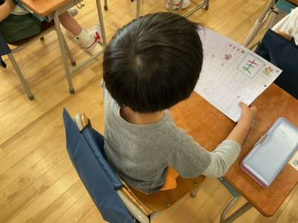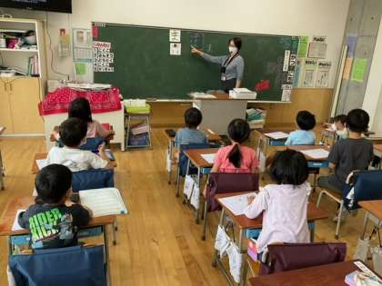 国語の時間です。今日のひらがなプリントは、「ま」です。「ま」のつく言葉をたくさん発表しています。