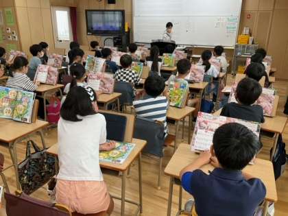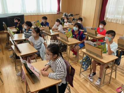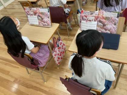 音楽の時間です。「さくら さくら」の楽譜を見ながら、ドレミを書き込んでいます。