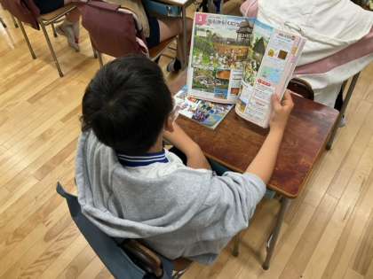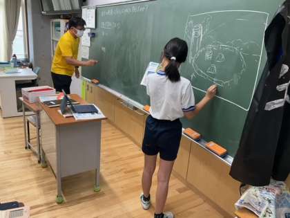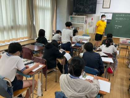 社会科の時間です。米づくりの発展によって、「むら」はどのように変化したのかを考えています。