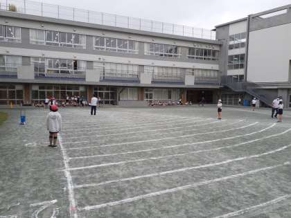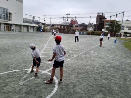 体育の時間です。ソフトボール投げをしています。遠くに投げるのは難しそうです。5年生が優しく教えています。