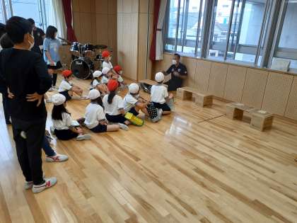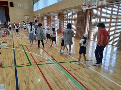 体育の時間です。初めてのスポーツテストを6年生に教えてもらいながら一生懸命取り組んでいました。