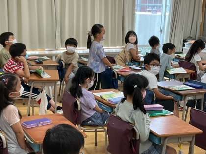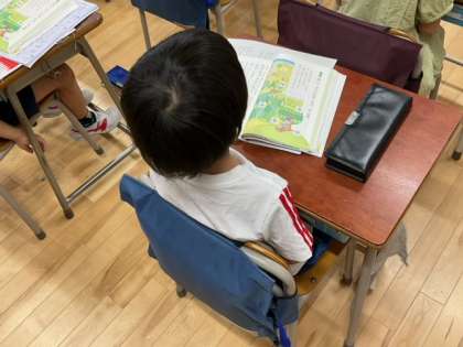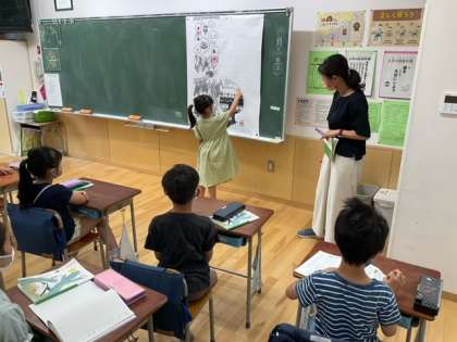 国語の時間です。「同じ ぶぶんを もつ かん字」絵の中の漢字を見て、同じ部分を探しています。