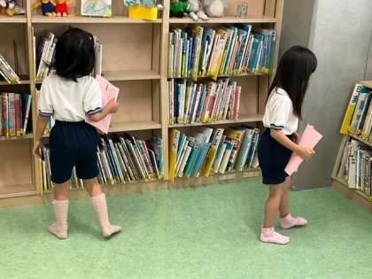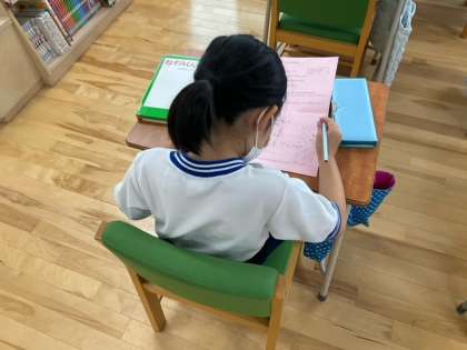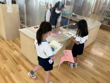 読書の時間です。読みたい本を選んだら、「としょかしだしカード」に本の名前を記入します。