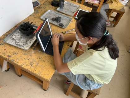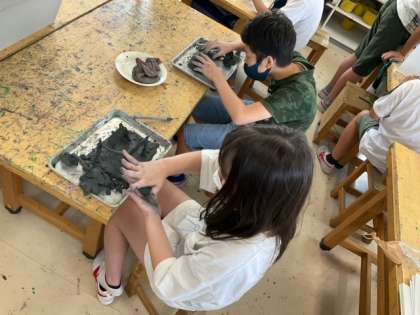 図工の時間です。「気持ちを 形に」平面的にならないように、360度見ることのできる作品を作っています。
