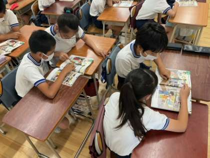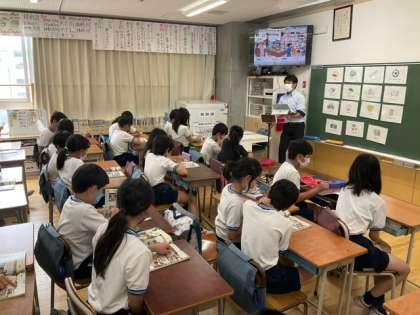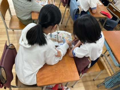 外国語の時間です。2人1組になって、ゲームをしています。英語を聞いて、友達より早くその絵を見つけることができるかな?