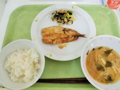 献立 ご飯、いわしのかば焼き、小松菜ののり酢和え、高野豆腐のみそ汁、牛乳
