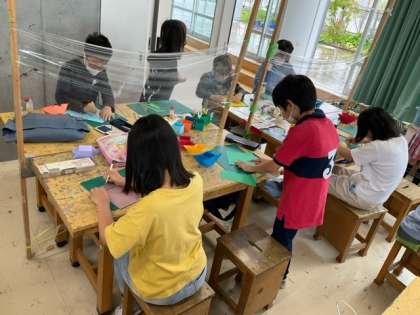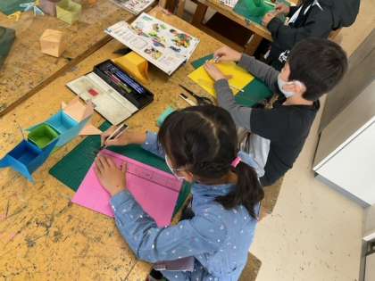 図工の時間です。「かみわざ! 小物入れ」箱の組み合わせを工夫して、見ても、使っても楽しい小物入れを作っています。