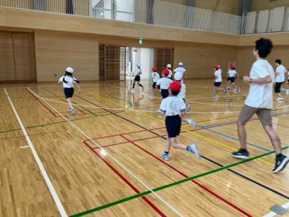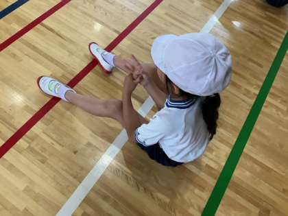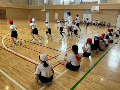体育の時間です。スポーツテスト「シャトルラン」に取り組んでいます。ペアで応援をしあっています。