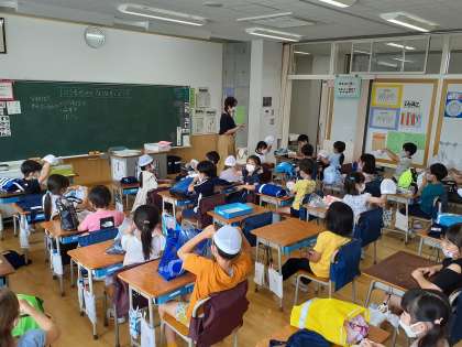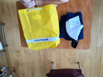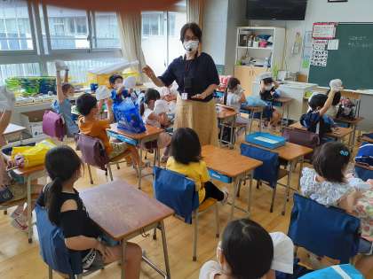 来週から始まるプールの準備の確認をしています。持ち物の確認やプールに入るときの流れを知り、楽しみにしている様子が見えました。