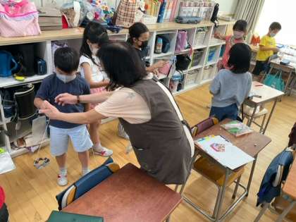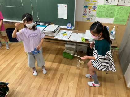 図工の時間です。紙けん玉が完成し、発表会をしたあと、みんなで遊んでいます。
