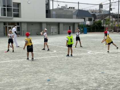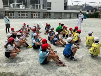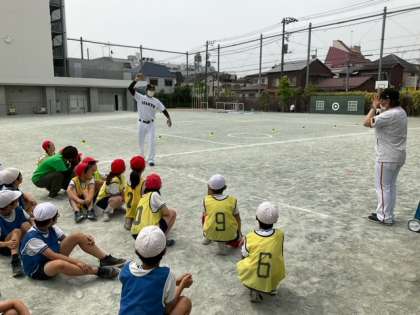 体育の時間です。今日はプロ野球のジャイアンツの選手が、先生として教えにきてくださっています。