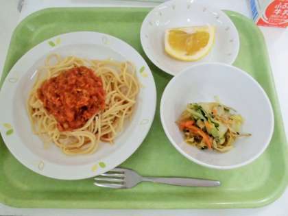 献立 ミートビーンズソーススパゲッティ、ごぼうチップスサラダ、河内晩柑、牛乳