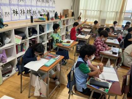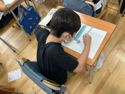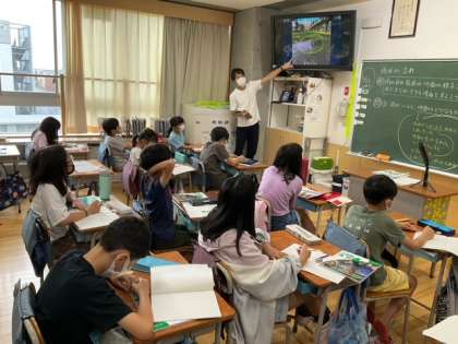 理科の時間です。「雨水の流れ」雨の日の校庭の地面の様子を調べて。水たまりができる理由を考えています。