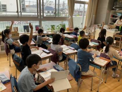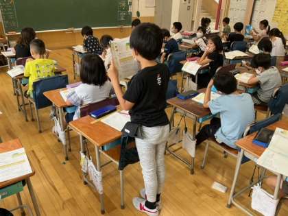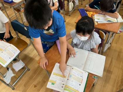 算数の時間です。「長さ」の学習をしています。友達同士で教え合いながら学習を進める姿がすばらしいです。