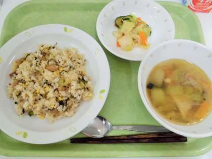 献立 青菜チャーハン、キャベツときゅうりのキムチ風、わんたんスープ、牛乳