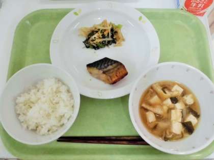 献立 ご飯、さばのピリ辛ソースかけ、野菜のごま和え、えのきのみそ汁、牛乳