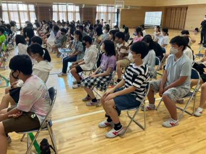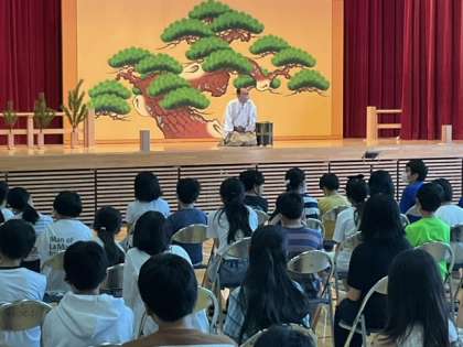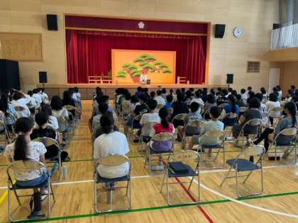 下北沢小学校の体育館を会場に、池之上小学校のみなさんと合同で古典鑑賞教室を開催しています。直接触れると迫力が違いますね。