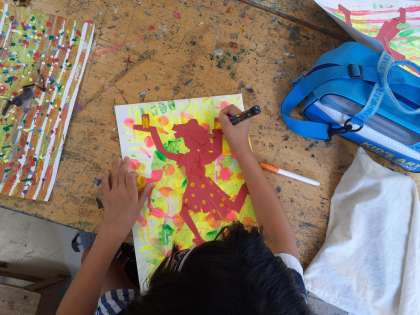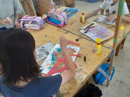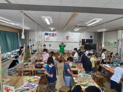 図工の時間です。筆やローラーを使って色を付け、その上に黒い紙をちぎって、躍動感あるダンシングブラックマンを表現しました。