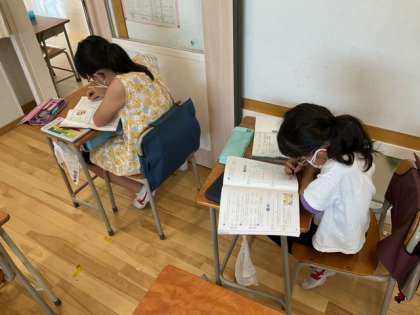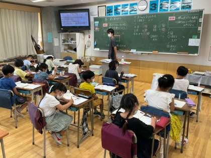 算数の時間です。ぼうグラフを見て、横軸の1めもりは、何を表しているのか、などを考えています。