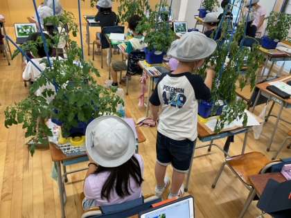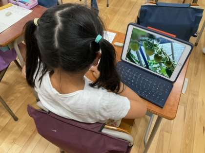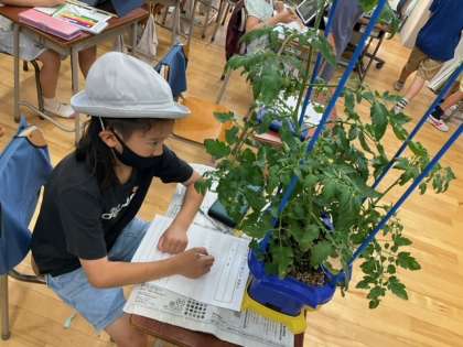 生活科の時期です。「ぐんぐんそだて おいしいやさい」ミニトマトの実が、ずいぶん大きくなりました。