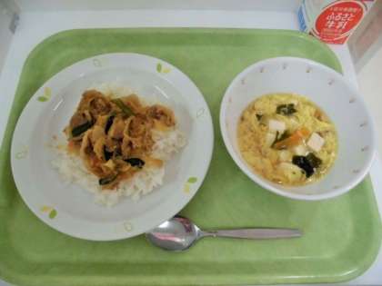 献立 切干大根入りスタミナ丼、卵とわかめのスープ、牛乳