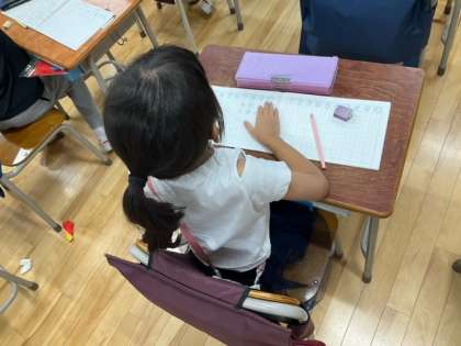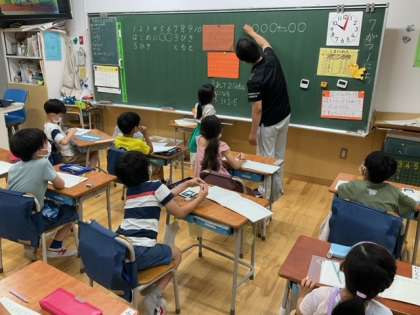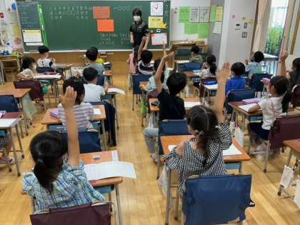算数の時間です。「水槽の中に、金魚が5匹います。3匹取り出すと、残りは何匹ですか?」図を使って考えましょう。