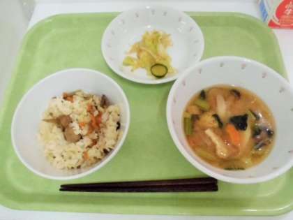 献立 とりめし、野菜のかぼすドレッシングかけ、大分だんご汁、牛乳