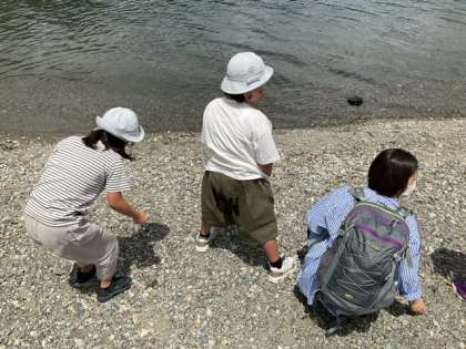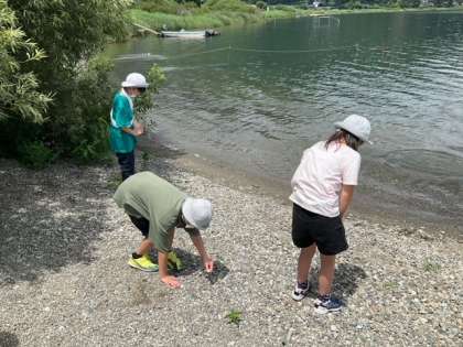 河口湖畔で石投げに挑戦しています。風が気持ちいいです。