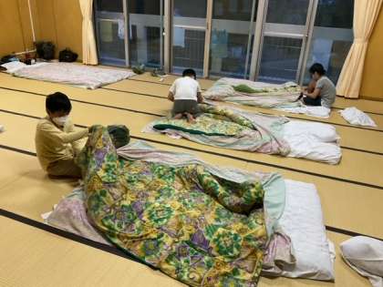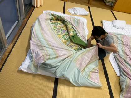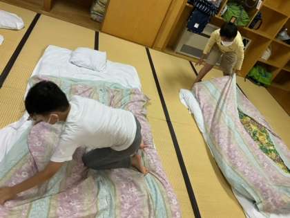 就寝準備をしています。掛け布団カバーはむずかしいのですが、自分の力でしっかりできました。成長を感じます。