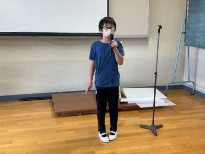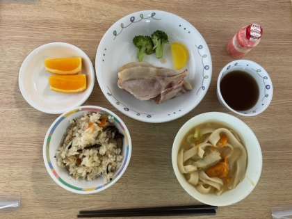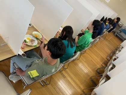 2日目の夕食の時間です。下北沢小学校の児童が、立派にあいさつをしました。メニューには、名物のほうとうがあります。