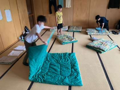 健康観察をして、布団の片付けが始まっています。考えながら自分の力で取り組んでいます。
