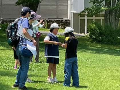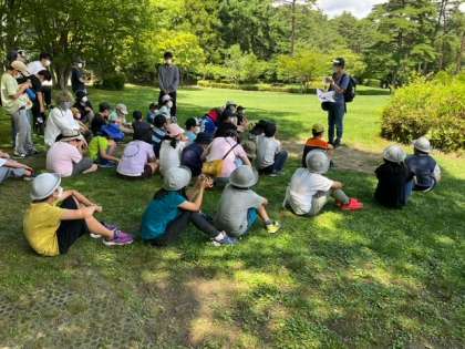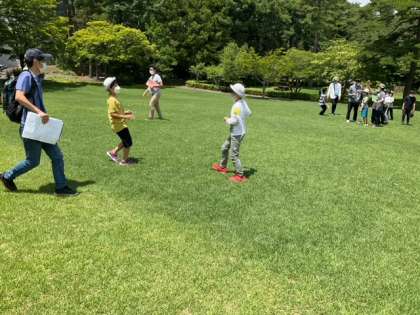 昨日の子ども会で仲良くなった4校が、恩賜林庭園でどんジャンケンをして交流しています
