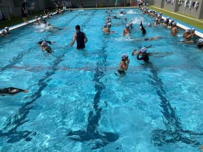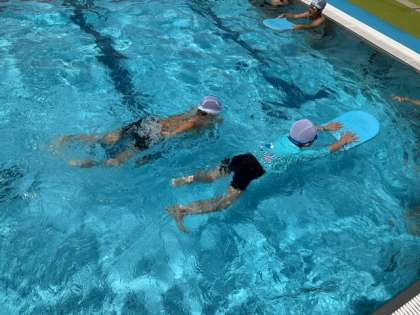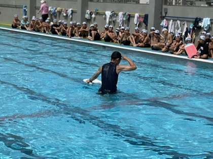 水泳の時間です。泳ぎの基本となる、けのびとバタ足の練習をしっかり行っています。