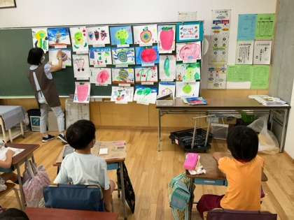 図工の時間です。「大きくそだて びっくりやさい」これから発表会をします。どうすると、こんなに大きく育つのかな?