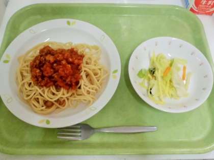 献立 スパイシーミートソーススパゲッティ、パリパリポテトのサラダ、牛乳