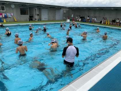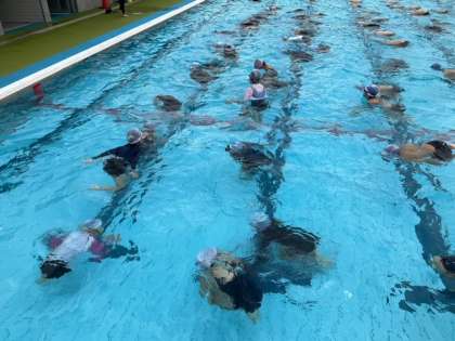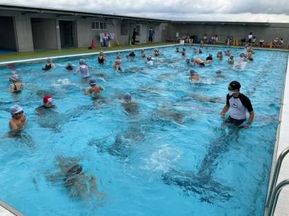 水泳の時間です。様々な種類の水慣れを経験しています。だるま浮きで、水中で体を浮かす感覚もとても大事ですね。