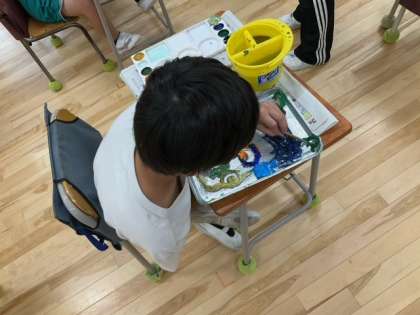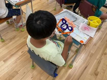 図工の時間です。ひもをつなぎ合わせて、顔を作りました。そのあと、思い思い日光色をぬって、楽しい顔が出来上がりました。