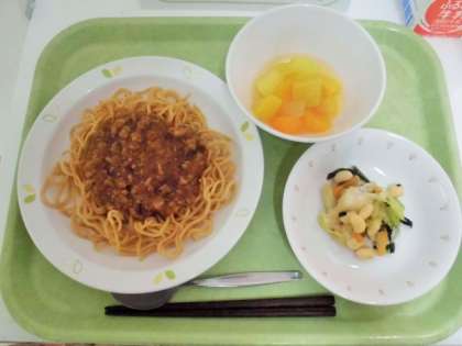 献立 ジャージャー麺、大豆入りゆで野菜、フルーツポンチ、牛乳