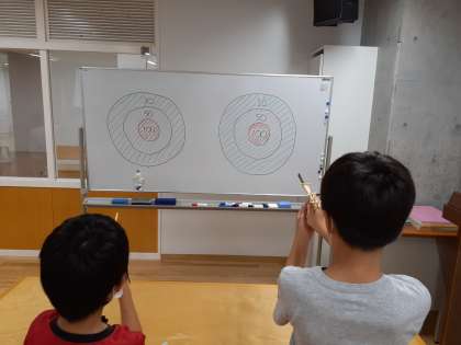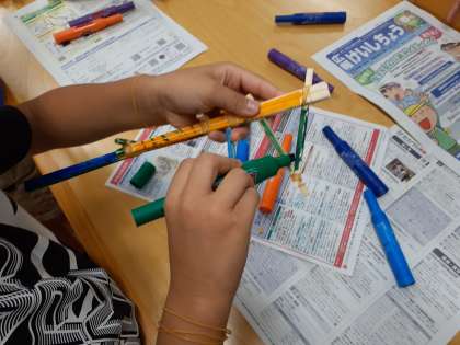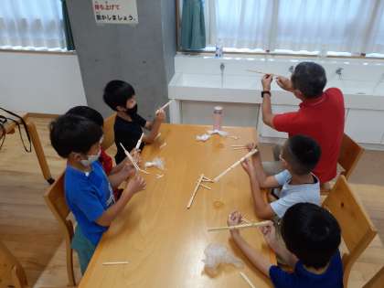 割りばし鉄砲と紙鉄砲のワークショップです。講師の方々に教えてもらいながら、上手に作ることができました。自分の作った割りばし鉄砲を使って的当てをするのはすごく楽しそうです。紙鉄砲もいい音をたくさん鳴らしていました。