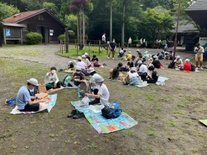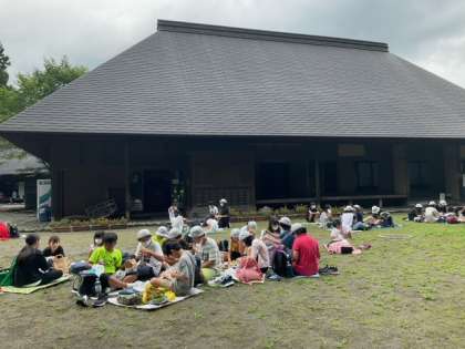 古民家を前に、お弁当タイムです。どの顔も、うれしそうです!