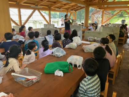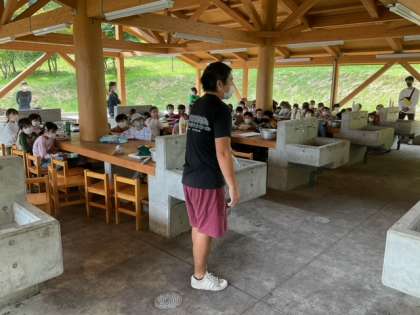 カレー作りが始まります。指導員の方の説明を真剣に聞いています。協力して安全に進めましょう!