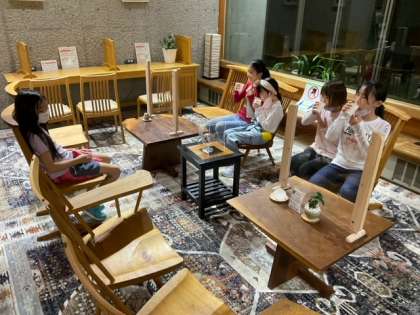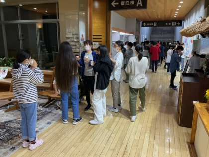 キャンプファイアで大いに盛り上がった後は、ロビーでおいしいリンゴジュースでのどを潤しています。川場のリンゴジュースは、最高です!
