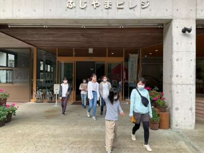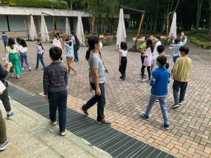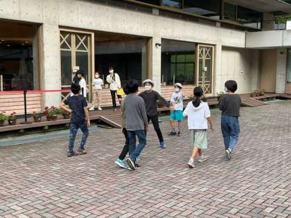 これからお祭り広場で、朝会を行います。宿舎を出ると「わあ、涼しい」「すごく気持ちいい」という声が聞こえてきました。